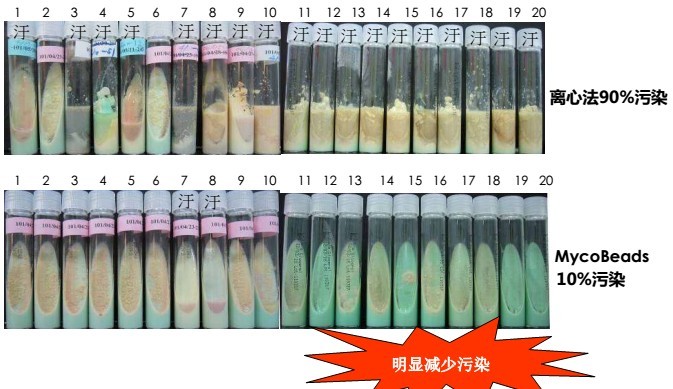 2.MycoBeads分離后的結核分枝桿菌經培養具有更少的污染--與離心法分離法進行比較