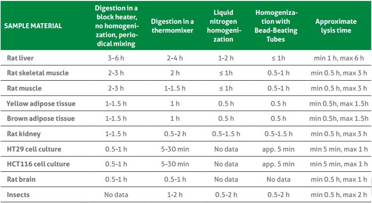 大約12 分鐘(未計(jì)算裂解時(shí)間)。樣品處理大約需要10-60分鐘的,不同樣本常用處理方法耗時(shí)請(qǐng)參考下表: