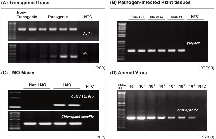 圖3. Punch-it分離不同樣本總核酸效果。Punch-it分離核酸結(jié)合在膜上,實(shí)驗(yàn)中直接使用膜作為PCR或RT-PCR模板, NTC:陰性對(duì)照。