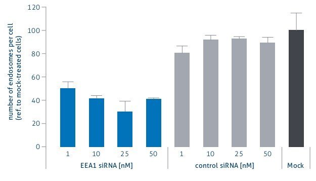 Viromer®BLUE轉染原代巨噬細胞,在384孔板中,使用Viromer®BLUE轉染siRNA targeting EEA1到原代巨噬細胞(從buffy coat PBMC 現分離)中,檢測endosomes 水平(siRNA targeting EEA1會導致endosomes 水平降低)